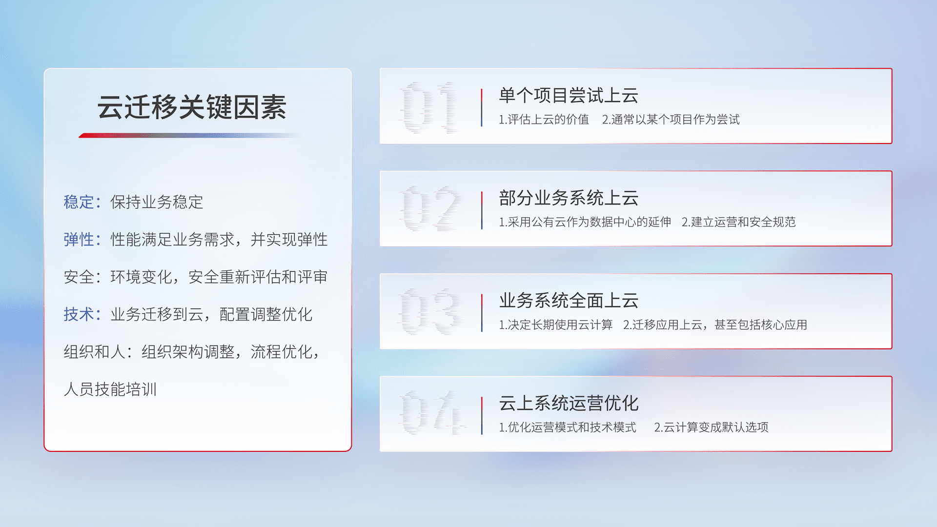 结合实际业务,,,从规划设计、、、云平台选型、、、云原生改造、、数据迁移、、集成交付,,,迁移全过程为客户识别最佳上云路径,,,做好风险识别管理,,,,设计网络架构、、、、身份权限、、安全审计合规、、、操作审计、、、日志审计、、、、监控告警策略、、多站点容灾设计等,,,,对云上基础设施进行整体规划,,提升IT治理水平,,以满足弹性、、高可用、、、、高性能的需求。。。