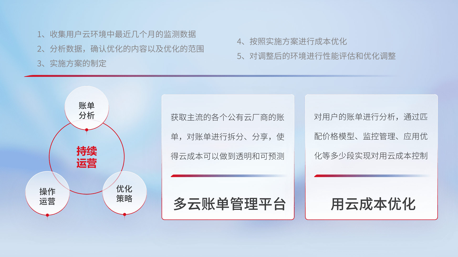 通过多云纳管,,,以统一的资源数据模型把客户的云资源进行抽象和封装,,进而实现对多云资源的统一操作,,保障云资源管理的可靠性、、、、稳定性与可用性。。。量身定制化运维内容,,配置、、、、开发运维、、、补丁管理、、、、备份、、、、监控、、、认证和访问管理、、、审计和日常巡检等,,保障在用云过程中的可靠度,,,,稳定度以及高可用率。。