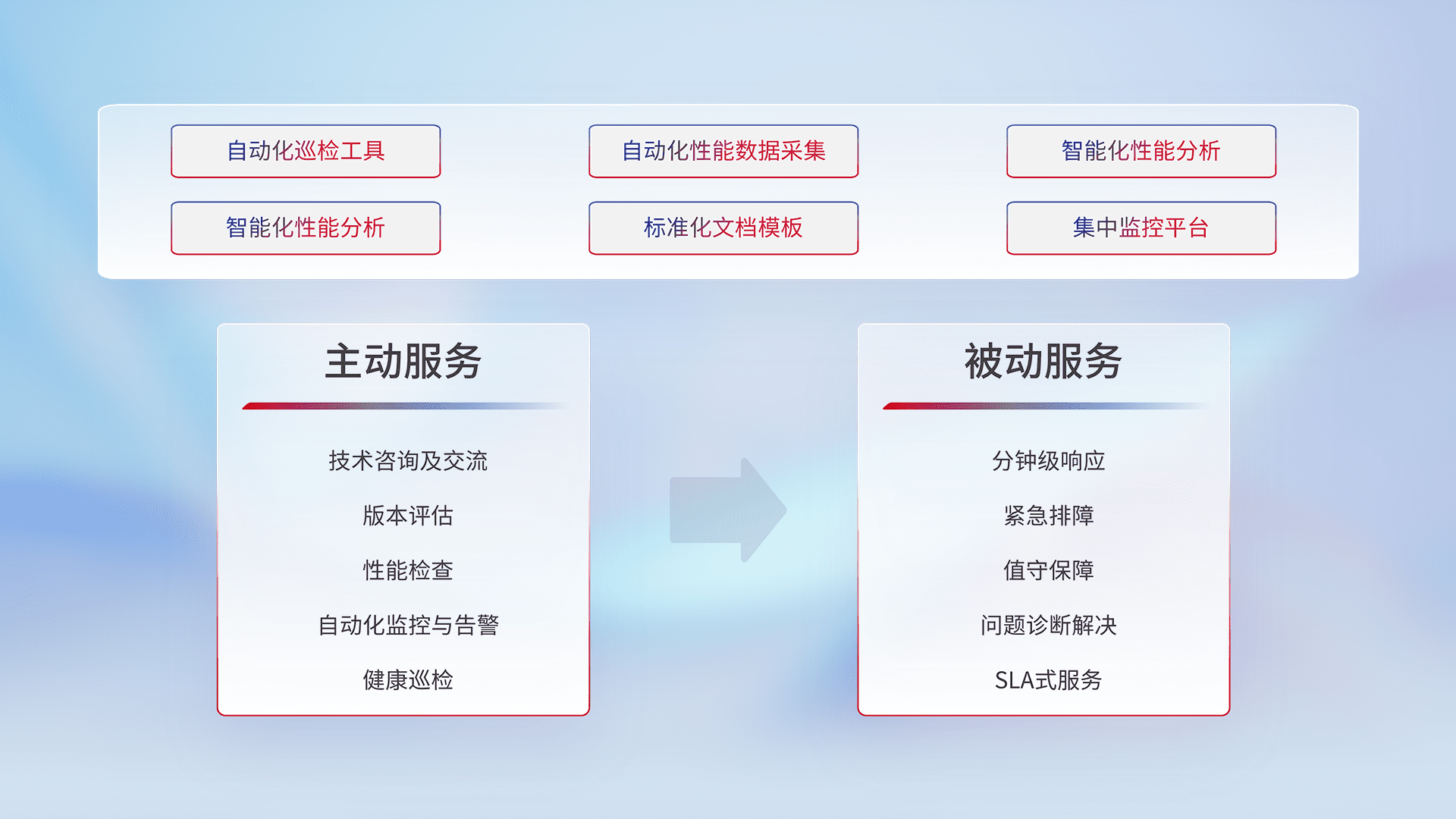智能化工具和标准化文档,,,,保障服务质量,,,,提供主动服务(包含技术咨询、、、版本评估、、性能检查、、、、自动化监控与告警、、健康巡检)和被动服务包含(分钟级响应、、、、紧急排障、、、值守保障、、、问题诊断解决、、SLA服务)。。。。